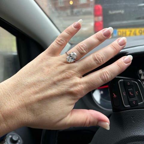 Der er 17 prinsesseslebne diamanter på hver 0.09ct, samlet 1.52 ct og 17 baquetteslebne diamanter på 0.03ct, samlet 0.52, dvs samlet carat i alt 2.04ct