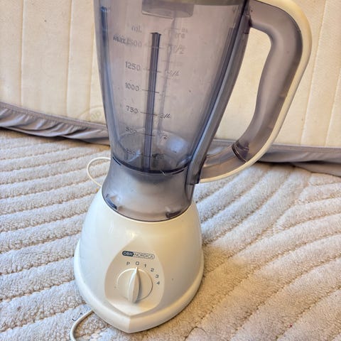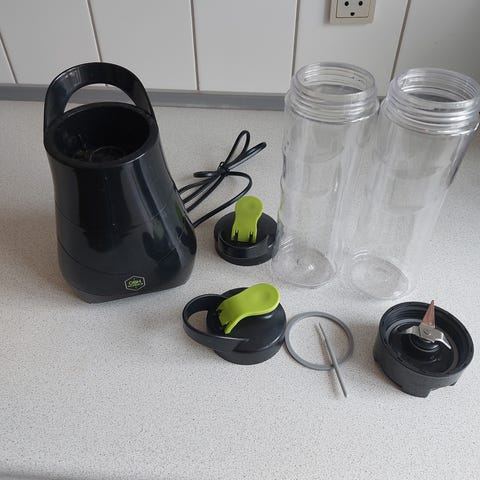 Den er lettere brugt og fungerer som den gjorde da vi købte den. Den eneste fejl er, at flaskerne har været i opvaskemaskinen én gang, hvilket har deformeret bunden på flaskerne en smule – det påvirker dog ikke funktionen. Det er en meget smart og praktisk blender, med pulse-funktion til frosne bær og to BPA-frie flasker. Ideel til smoothies, også på farten. Sælges, da den ikke længere bliver brugt.