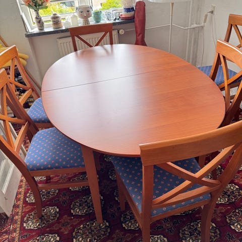 Spisebord og 6 stole, plus 2 ekstra plader