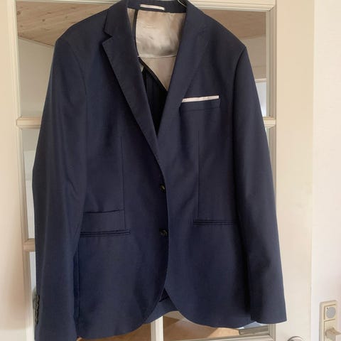 Blazer, Nifty, str. 14 år, Flot mørkeblå blazer og hvid skjorte med små prikker. Der er et slips med og lommeklud. Alt kun brugt ‘en gang. I rigtig flot stand.