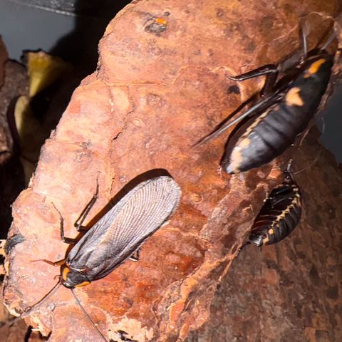 Lucihormetica verrucosa er en smuk kakerlakart, der yngler godt i fangenskab. De voksne hanner har de karakteristiske orange glødepletter på deres pronotum, det har hunnerne ikke.