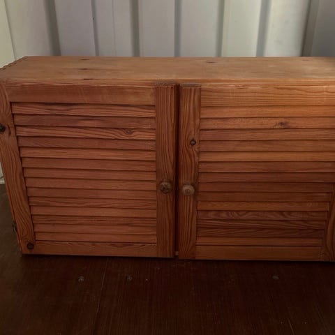 Solidt trappemøbel/kommode/gangskab. Skal have nye greb og evt males, eller kan bruges som åben kommede uden låger. Fx som skoskab. Møblet er tungt og robust. Sjovt for børn at klatre på. Afstand fra gulv til nederste “trin” = 43 cm