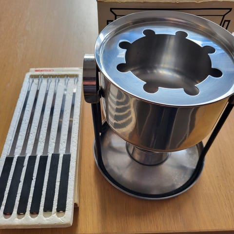 Farvemarkering på de to sæt, så man kan kende sin gaffel, når man stikker den i fondue gryden.