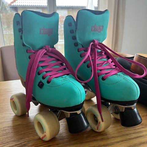 Bud modtages gerne.. Rulleskøjter, Chaya, str. 40, Super fede Chaya Air brush side by side skøjter, næsten ikke brugt da knægten som var ejermanden, hurtigt, ALT for hurtigt vokse ud af dem igen.. så de er kun brugt to gange af 20 minutters varighed. Du får simpelthen ikke et bedre tilbud på SÅ FEDE skøjter andre steder..! Hvis du ikke slår til med det samme, så risikerer du at gå glip af disse pragt eksemplarer...
