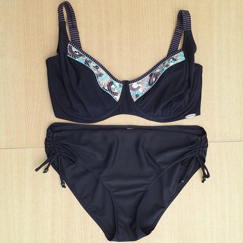 Badetøj, Sunflair, str. 42, c-skål, tankini i lysegrå/hvid med indbygget BH, rynkende effekt og justerbare stropper. Brugt under 10 gange. Nypris 900 kr.