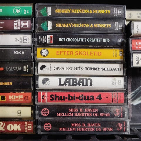 Kassettebånd: Kassettebånd, pop, 13 kassettebånd med diverse musikoptagelser på - bl.a. Danser med drenge, Michael Jackson, Cher, Take That.