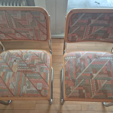 Betrækket er slidt på dem alle, men stadig brugbart.