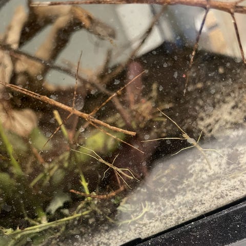 Vandrende pinde, 5-10 små eller mellem vandrendepinde i et lille glas med låg og lufthuller. Skal du afprøve at have vandrendepinde, så er det meget let. De skal have lidt brombærblade, efeu eller hindbærblade og så lidt vand. Verdens nemmeste dyr og ikke verdens farligste…
