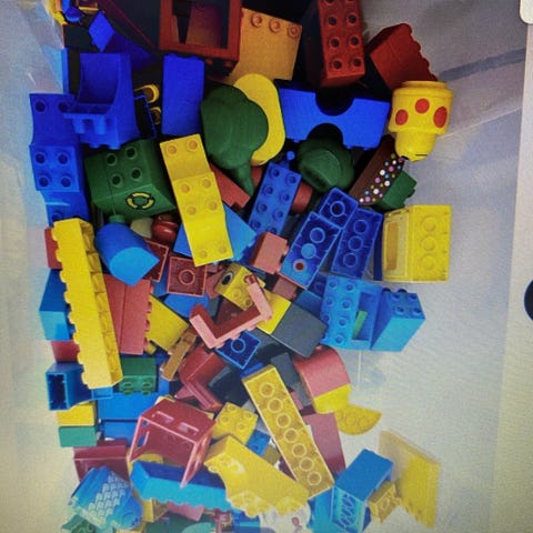 Lego Duplo, Duplo, Lego Duplo, en hel pose fuld af diverse (biler, huse, kraner, dyr, klodser mv).