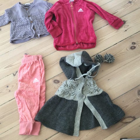 Sættet består af en trøje, bukser og vest. Trøje: 33 cm lang og 25 cm bred.