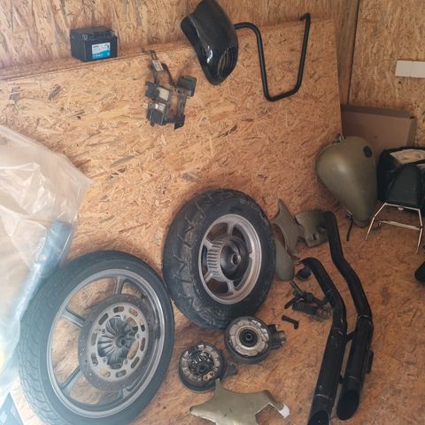 Kædeskærm, støddæmper, cover v. side, fortandhjul, originale slanger, filter, relæ, holder til start-relæ, skygge til forlygte