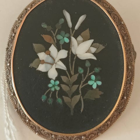 Broche , Mikro mosaik og guld, 100 år gl., Broche lavet af mikro mosaik i Italien. I mosaikken er dannet ordet "ROMA". På bagsiden er den stemplet "8 c", hvilket tolkes som 8 karat guld. Den er 6 cm lang og ca. 1 cm bred.