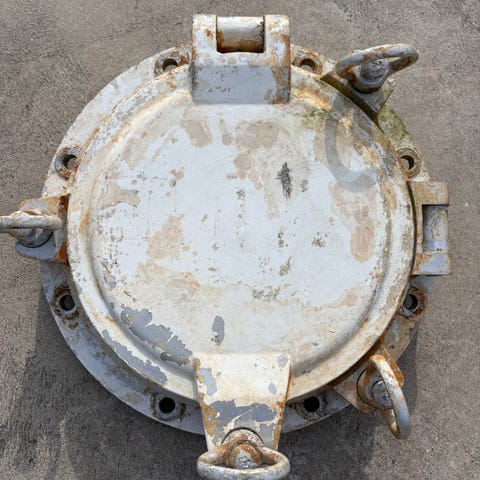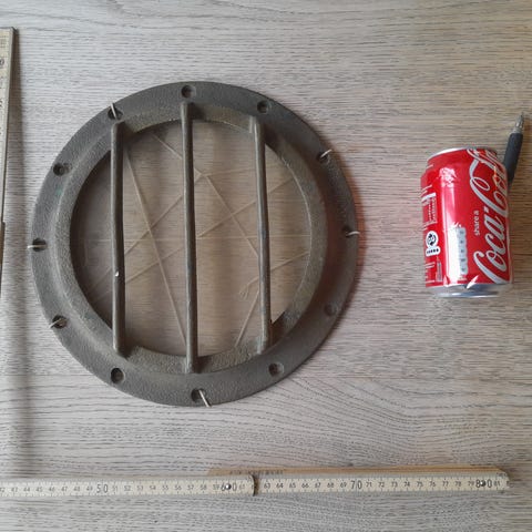 Stor fin koøje, med stormluge og 90 mm inddækning i messing/rødgods, glas ø,23,7 cm ,total ø 32 cm. Vægt ca, 13 kg. Kan sendes.