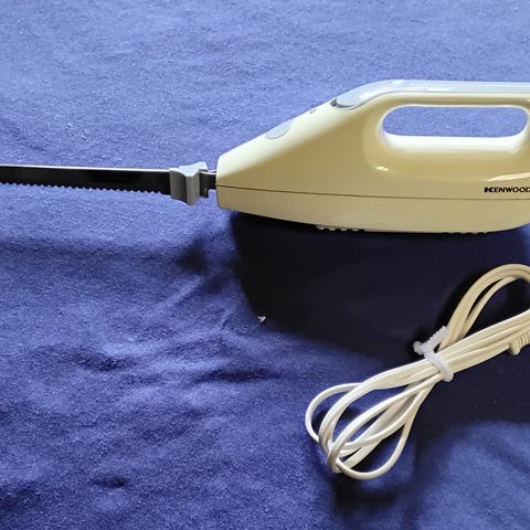 EL-kniv, Kenwood, Ubrugt el-kniv, Den er en gave jeg bare længe har haft opbevaret i en køkkenskuffe som reserve, da jeg selv har en magen til, Kniven er især god til at skære steg, hamburgryg, og andet kød i fine skiver. Men også anvendelig til at skære brød med. Den kan sendes med GLS eller købes hos mig i Nivå. Pris: