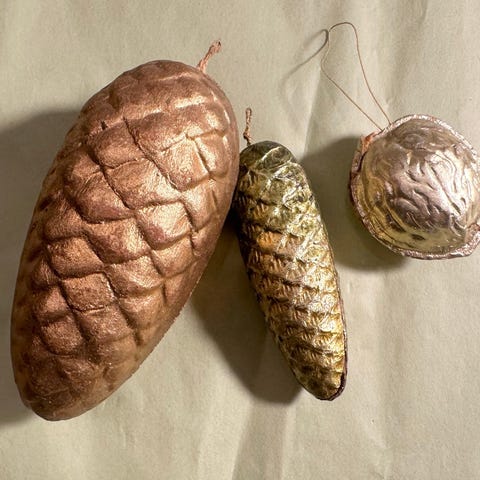 juletræspynt - fra 1949, 2 gamle kogler - længde 6 cm. - min mor købte koglerne i 1949 som noget af det første juletræspynt man kunne købe efter 2, verdenskrig.