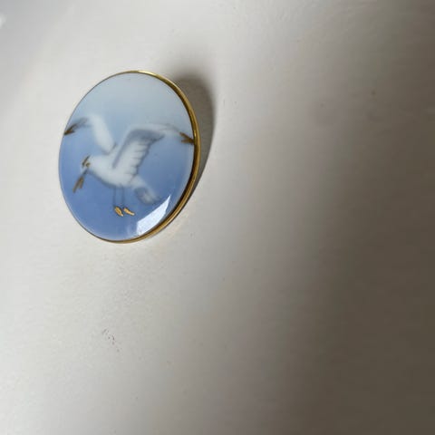 Broche, andet materiale, Bing & Grøndahl, Bing & Grøndahl broche i porcelæn. Lavet i forbindelse med Bing & Grøndahls 125 års jubilæum. Den er mærket Bing & Grøndahl, Copenhagen på bagsiden. Ingen skår eller afslag. I meget fin stand. Måler 3 cm. i diameter.