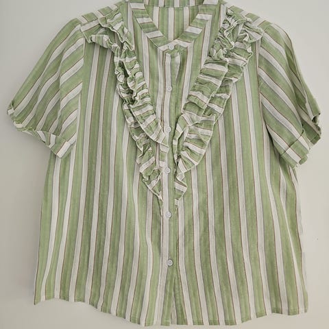 Hvid bluse med grønne/blå striber, mrk. ERFO, str. 50.