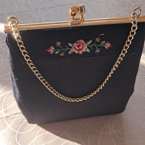 Festtaske, Retro, silke, Fin, lille dametaske i brokade incl. lille, matchende kosmetikpung. Tændstikæsken for at vise størrelsen. Sandsynligvis ca. 70 år gammel, så ægte vintage. Almindelige brugsspor. Købes som beset og afhentes på min adresse i Kolding. Jeg sender ikke.
