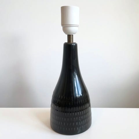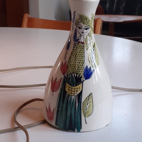 Bordlampe, Stavangerflint Inger Waage, Intakt og funktionsdygtig bordlampe fra Stavangerflint. Håndmalet af Inger Waage (1923-1995). Fra 50 erne. Fajance. H: med fatning i messing: 25 cm. Uden fatning 19 cm. Ø. I bund 11,5 cm