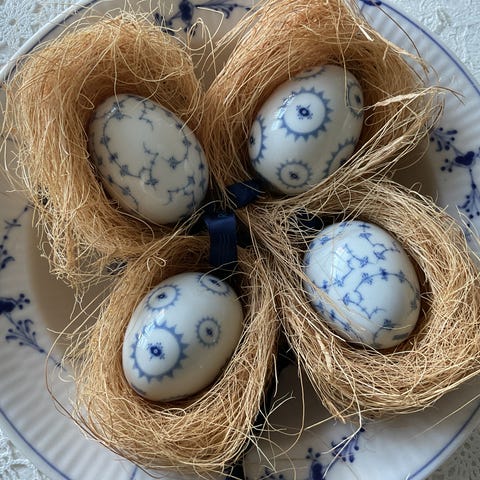• 4 stk smukke musselmalede æg i rede,