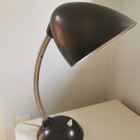 Eric Kirkmann Cole, designet 1929. Skønneste lampe i bakelit. I overordnet fin stand, men har et par skrammer; en lille revne i skærmen, som næppe ses, limet på indersiden så den er sikker - og et lille hak på foden. Fungerer fint Ny stofledning på 3 m samt nyt stik - Fast pris