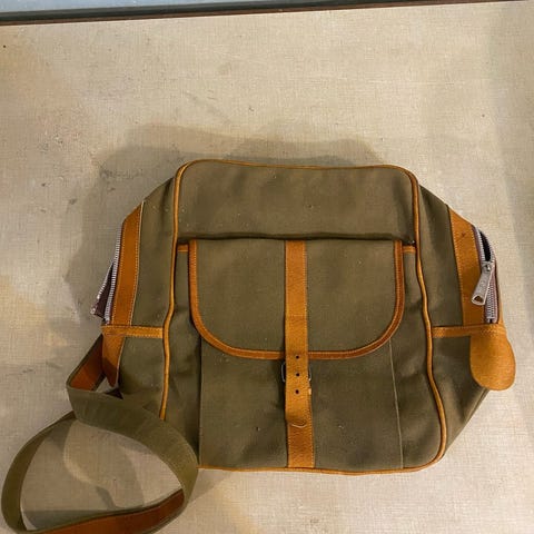 Kurér taske , Rimelig, Kurértaske, militær med aftagelig læderrem og refleks i grøn kraftig lærred. Den er købt i Sverige.