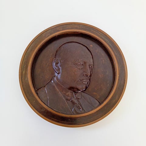 Bronze relief, Transitrade Ltd. , motiv: Ludvig Holberg, Bronzerelief udgivet i forbindelse med Ludvig Holbergs 300 prs jubilæum i 1984.
