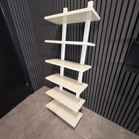 Vægreol, Fly fra Ilva, Reolsystem Fly fra Ilva med hvide hylder og hvide vanger.