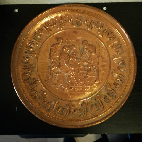 Flot antik kobber vægplatte med relief i meget fin stand. Motiv: Drueklase (Ø22,5 cm).