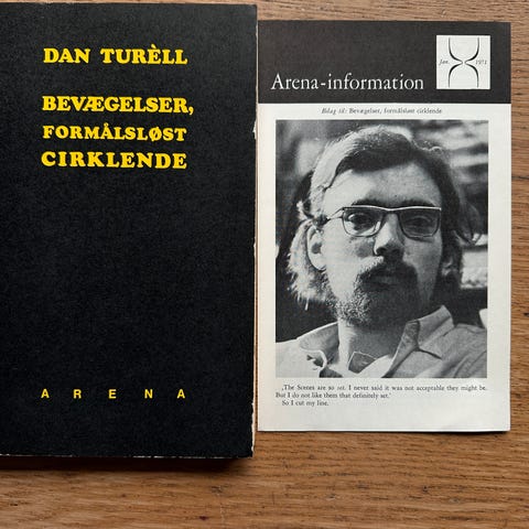 Dan Turèll: Bevægelser, formålsløst cirklende. Arena, Fredensborg januar 1971. 1. oplag. 190 sider. Hæftet med orig. omslag. Friskt og rent eksemplar. Sender gerne.