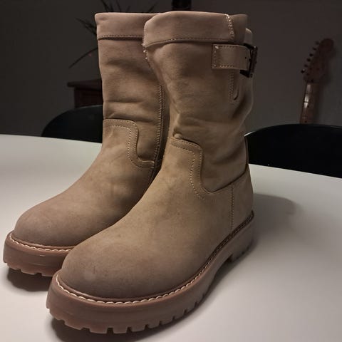 Støvler i størrelse 36 med brun farve. Materialet fremstår som imiteret ruskind. Støvlerne har en spids tå, høj hæl og lynlås på indersiden for lukning. Designet inkluderer en dekorativ rem med spænde rundt om anklen.