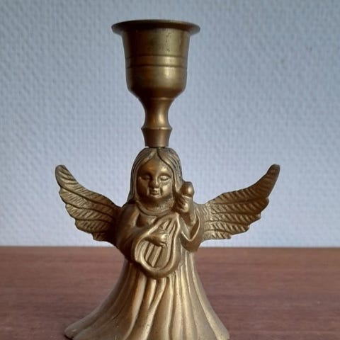 Julelysestage af messing. Syngende engel. juletræslys sættes i englens hænder.