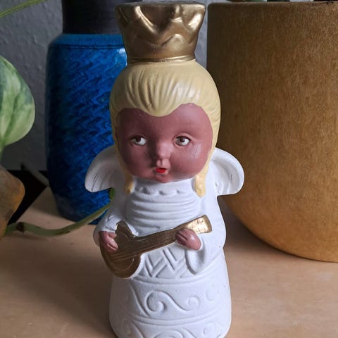 2 engle som julelysestager / musicerende englekor med harpe. Terracotta / keramik fra Gräfenroda, DDR / Østtyskland. De er dermed mindst 35 år gamle. Lyset (juletræslys) sættes i kronen.