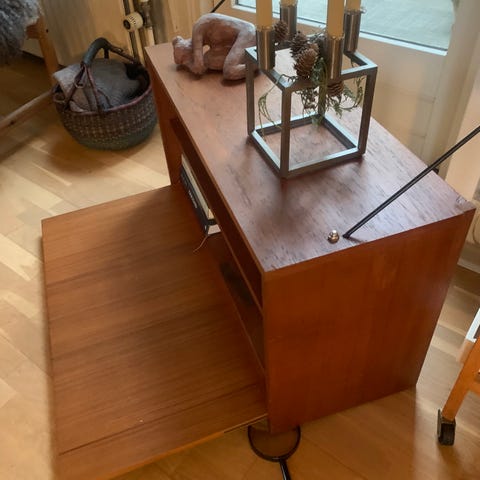 udført i fineret/massiv teaktræ og palisander med jalousilåge, lågen åbnes mod venstre. Kabinet/skabet er monteret på et stel af træ, hvor der er monteret hjul på stellets ben.
