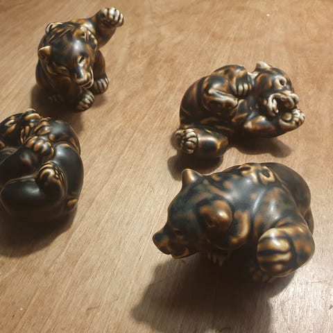 Stentøj, Figur: Terrier/løftet forpote, brun/mørk-glaseret, Royal Copenhagen / Knud Kyhn, mrkt.: 22774, ca. 9 cm lang, 6,7 cm høj.