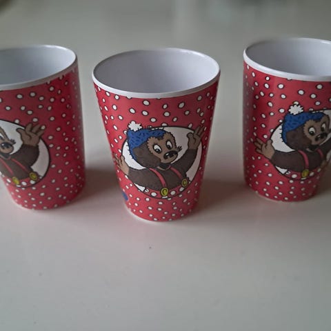 GURLI GRIS krus, udført i plast med motiver af Gurli og Gustav. Højde 9,5 cm, diameter 7,5 cm. Kruset fremstår i meget pæn stand.