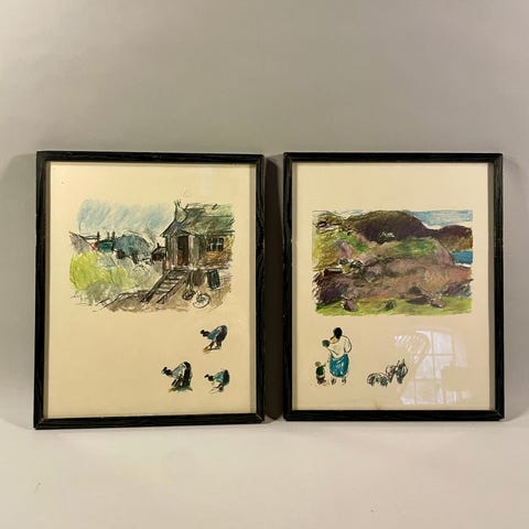 Plakat af Landnamsgård 982, b: 65 h: 66, Landnamsgård på Erik Den Rødes tid anno 982. Udgivet af Museumsudvalget Narssaq i forbindelse med 1000 året 982 - Narssaq - 1982. Narssaq august 1982. Udført af Jens Christian Rosing (28.7.1925-24.5.2008), som var en grønlandsk forfatter og billedkunstner. Han blev født i Ilulissat som søn af den grønlandske forfatter, præst og maler Otto Rosing.
