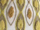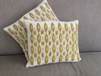 Stoffet er i naturhvid uld, hvorpå der er trykt hørfarvet rækker. Derefter er der broderet med både uldgarn og tynd bomuld / silketråd på og omkring disse rækker. Den pude er broderet med ecru farvet tråd omkring tekstiltrykket, den anden pude er broderet med gul tråd.