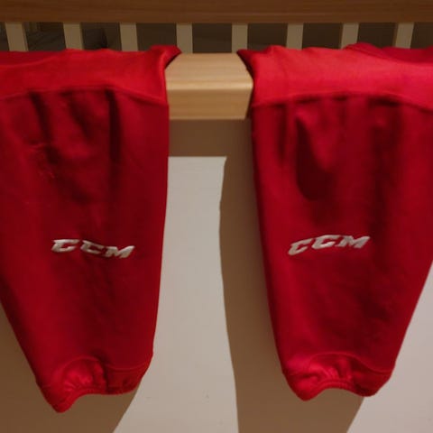 Hockeyudstyr, Gamacher, str. Small, Ishockey gamacher for børn. Har nogle mindre huller, men kan sagtens bruges i lang tid mere, og sælges derfor billigt.