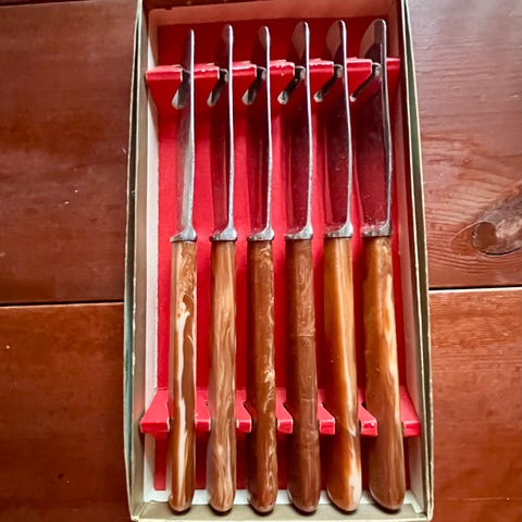 12 stk. flotte antikke Raadvad bordknive i rustfrit stål med smukke skafter af træ