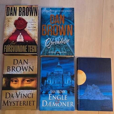 Tre bøger af Dan Brown: 'Da Vinci Mysteriet', 'Morderisk Bedrag' og 'Pankaj Koden'.