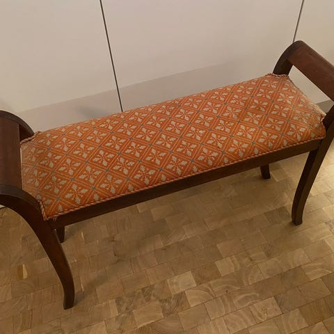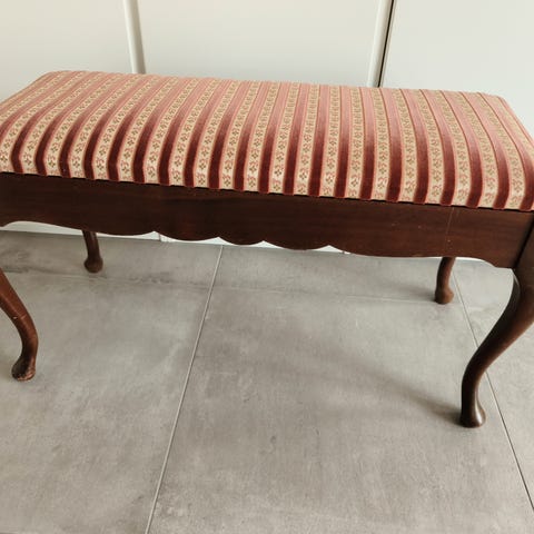Klaverbænk, Fint gammelt møbel i god stand med lidt patina. Har lidt ‘nister’ i stoffet