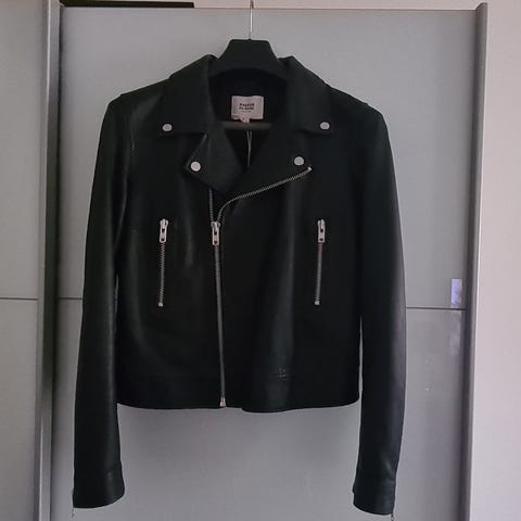 Jakke, str. 36, Le Sentier, Sort med guld nitter og guld lynlås, Blødt glat kalveskind, Ubrugt, Lækker kalveskindsjakke med guld nitter