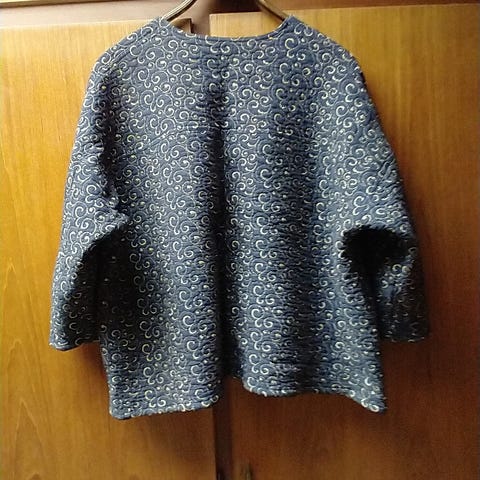 Anvendt 2 gange. Mørkeblå med rosa og blågrå blomster.