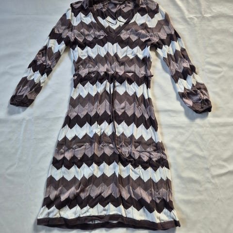 Smuk tunikakjole i en let satinagtig kvalitet med det fineste paisleyprint på en sort bund. Kjolen er svagt rundskåret forneden, har en god pasform, korte ærmer, lommer i siderne og en v-hals der afsluttes med et læg, der giver kjolen en smukt fald foran. BM ca. 50 cm og længden målt fra nakken og ned ca. 95 cm, hvor den er længst.