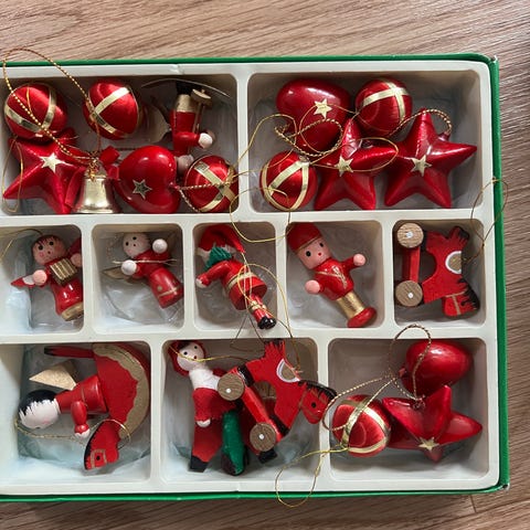Ældre julepynt sælges samlet. Nogle af englene har tabt en eller begge papvinger.