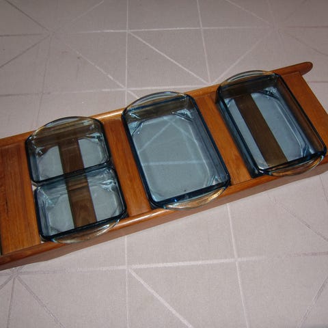 Caberet bakke, Jens Harald Qvistgaard, Caberet bakke i teak fra 60'erne designet af Jens Harald Qvistgaard med 5 glasskåle i blå nuance