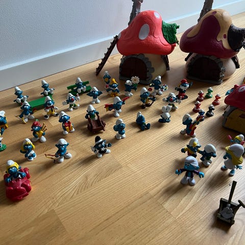 Smølfer, hus, originalt fra slut 1970erne. købte det selv dengang for mine "surt" opsparede penge. Der er leget meget med det, men der blev passet på det. Ses også ved at jeg stadig her sommerfuglen på taget. Det er der ikke mange der har.