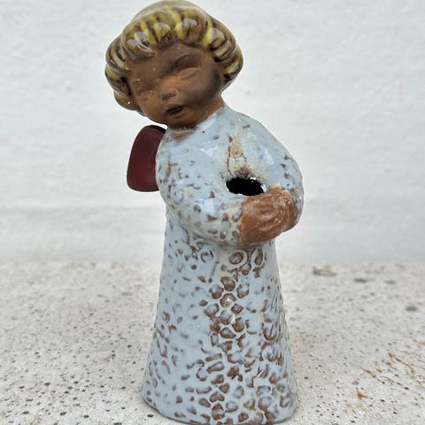 En ældre glas stage formet som en kær syngende engel der holder et lys i hver hånd. Figuren er fra tyske Goebel, W. Germany og er lige til at stille i vindueskarmen og sprede juleglæde evt. sammen med andre julestager eller lidt julepynt.