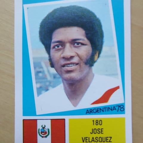 Fodbold samlemærke fra 1978 af den peruvianske spiller Hugo Sotil (mærke 179).